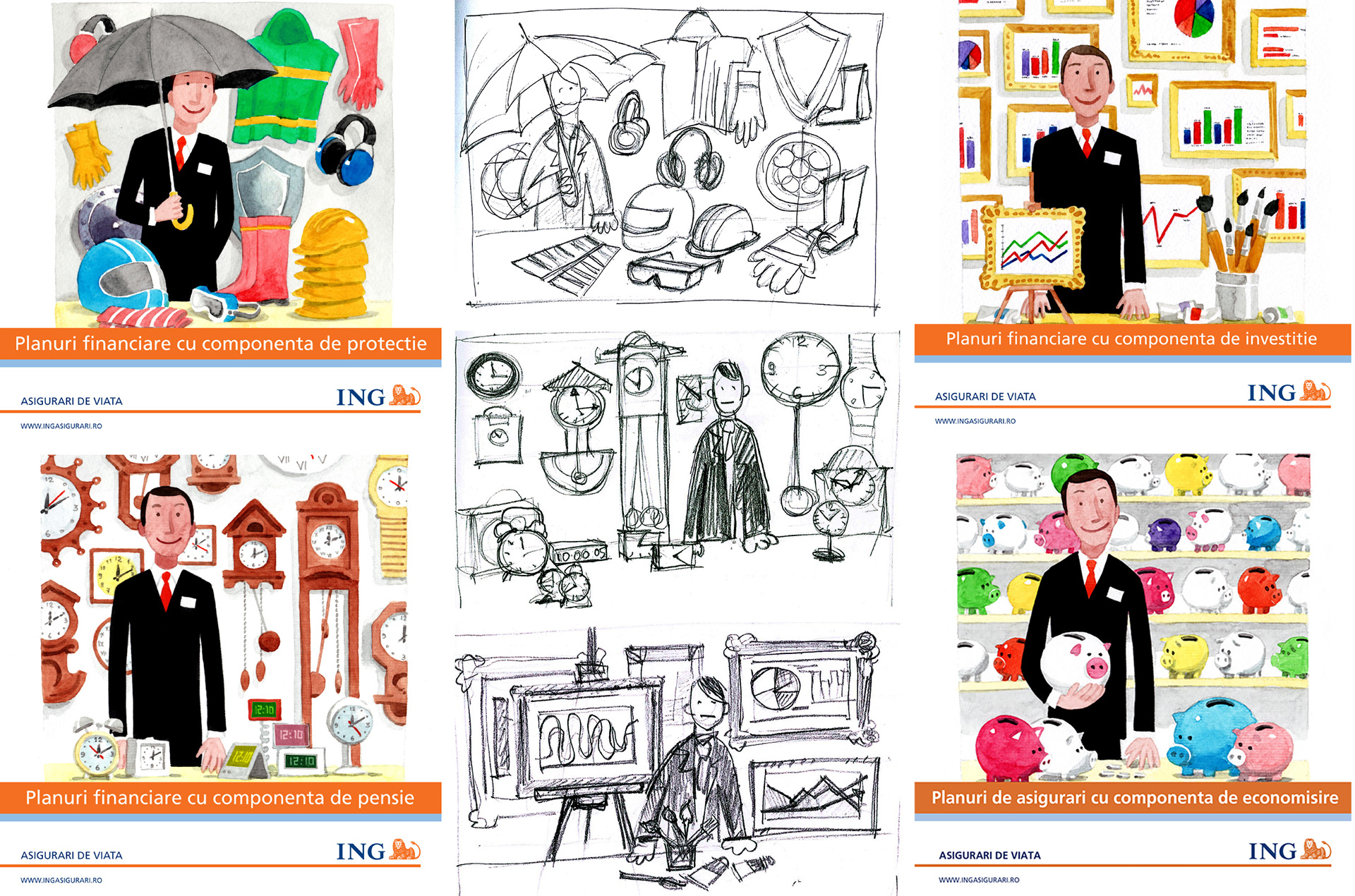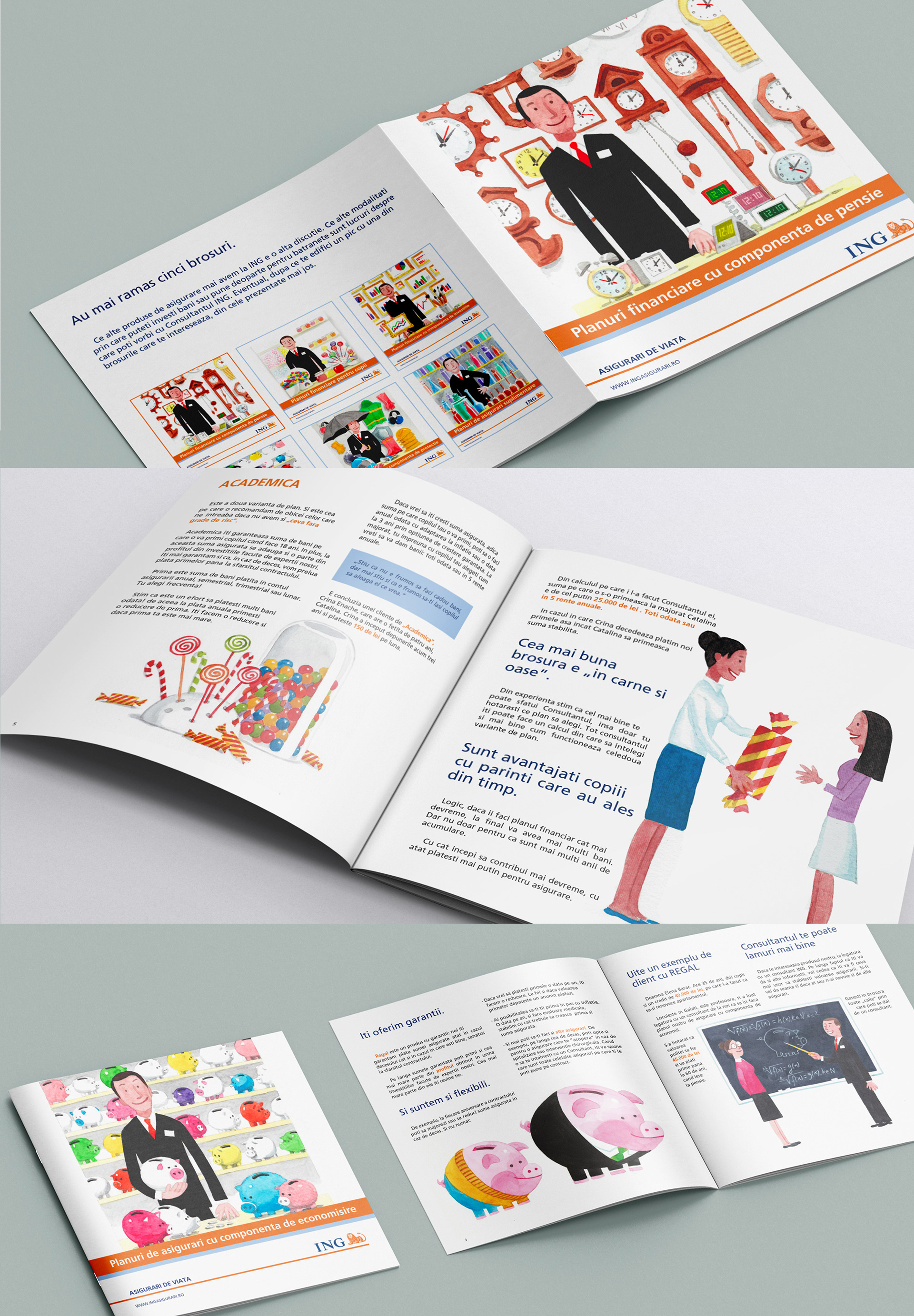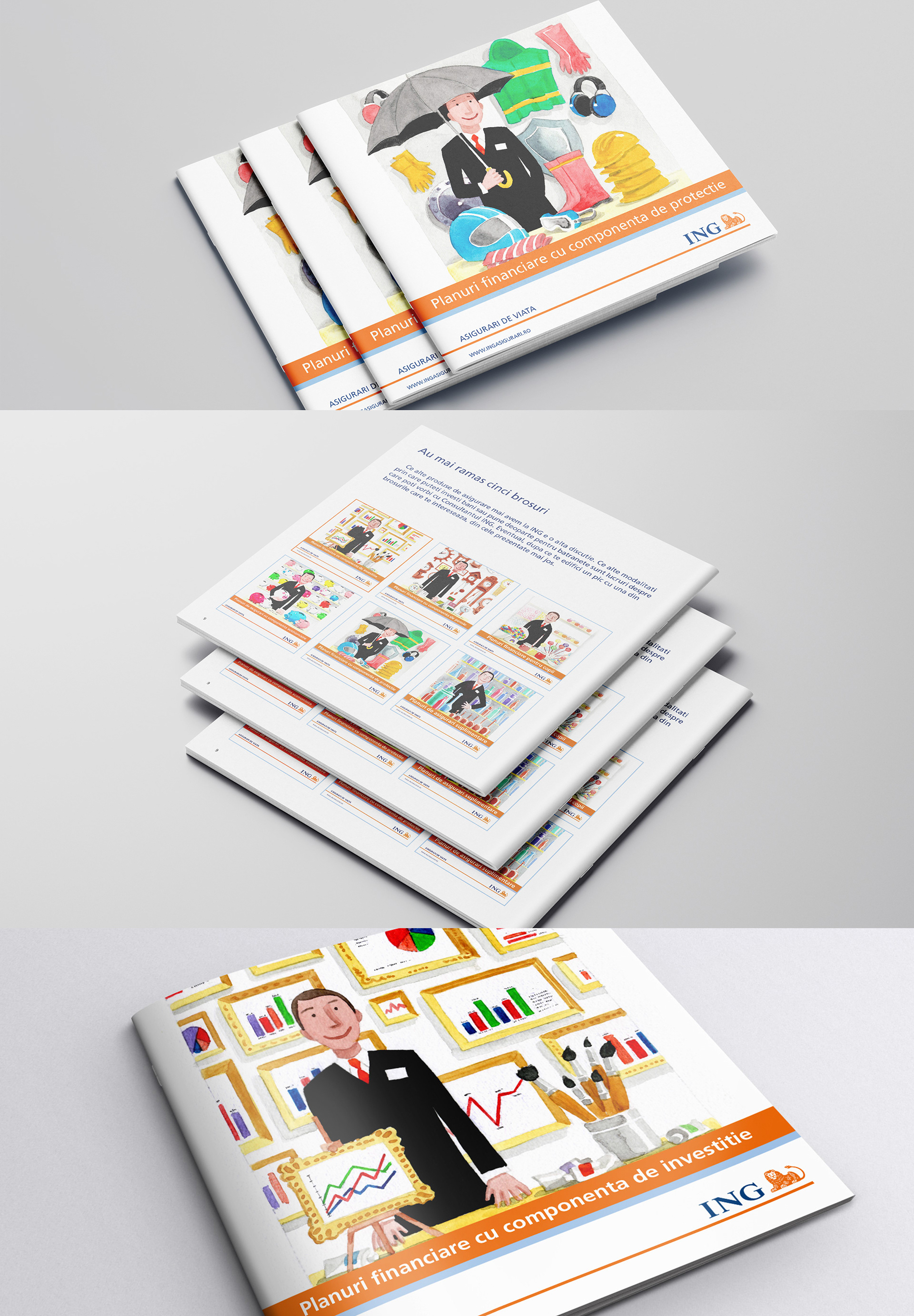 I worked closely with the copywriter and illustrator, art directing and designing 6 brochures for 6 different financial products offered by ING Romania.
